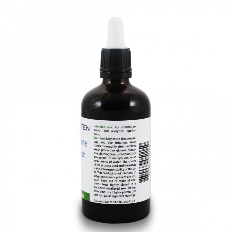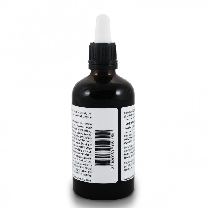 Upozorenje: Može izazvati iritaciju kože, dišnog sustava i očiju. Nakon rukovanja temeljito operite ruke. Nositi zaštitne rukavice/zaštitnu odjeću/zaštitu za oči/zaštitu za lice. Ako dođe u oči/kožu isprati s puno vode. Odabir korištenog procesa i korištenja isključiva je odgovornost korisnika. Ovaj proizvod nije namijenjen za dijagnosticiranje, liječenje ili prevenciju bilo koje bolesti. Čuvati izvan dohvata djece. Čuvati dobro zatvoreno u tamnom, dobro prozračenom prostoru. Metilen plavo je vrlo moćna boja i može uzrokovati značajne mrlje.